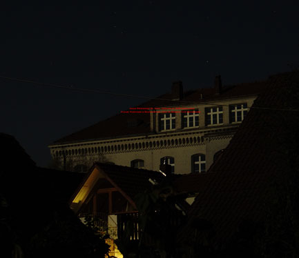 The old building of the High School - enormous for Petershaeger conditions - towers above the roofs of the old part of the town (or village). A Nightshot from my yard into the asterisk-clear full moon night. Directly beneath and/or in the roof the window row of the old art hall can be seen. My memories of it are firmly linked with the art educator and painter Benno Kersting Pax.